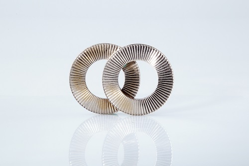 防松墊圈工作原理非常簡單。它由兩片墊圈組成。外側(cè)是帶有放射狀凸紋面,而內(nèi)側(cè)為斜齒面。當(dāng)裝配時(shí),內(nèi)側(cè)斜齒面間相對(duì),外側(cè)放射狀凸紋面與兩端接觸面成咬合狀態(tài),當(dāng)連接件受到振動(dòng),并使螺栓發(fā)生松動(dòng)趨勢(shì)時(shí),僅僅允許兩片墊圈內(nèi)側(cè)斜齒面間相對(duì)錯(cuò)動(dòng),產(chǎn)生抬升張力,從而達(dá)到100%的鎖緊效果。其制鎖原理符合軍用標(biāo)準(zhǔn)。